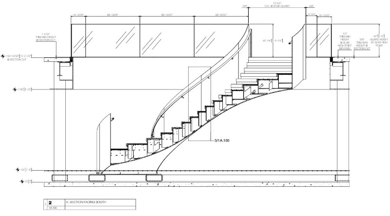Feature stair for a Manhattan Healthcare company with wood treads and a guardrail of formed steel plate painted a rich metalic blue.