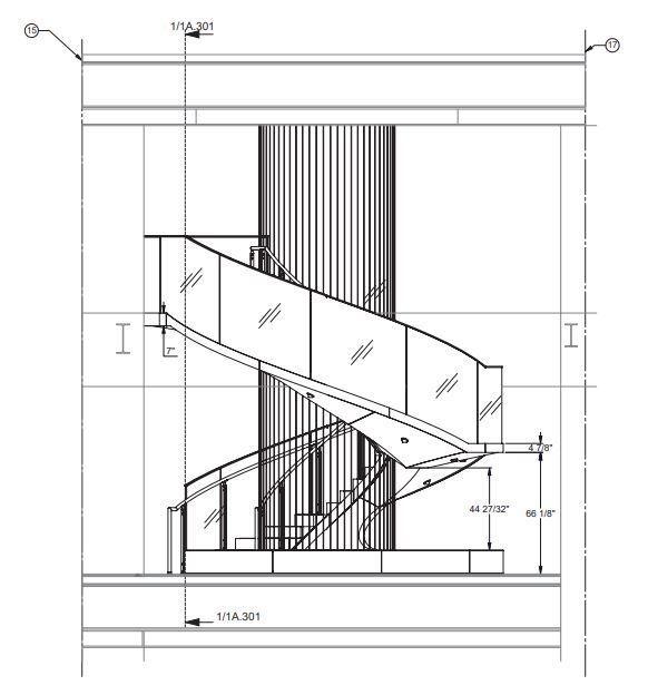 Two identical curved stairs for Blue Owl Capital in Manhattan. The steel carcass was fabricated out of discrete modules assembled to wrap around a spring loaded tension cable system and clad in FRP. A Terrazzo walking surface is inlaid with bronze traction strips and the handrail is wrapped in leather.